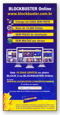 Nessa promoção da BLOCKBUSTER desenvolvida em conjunto com a DOMINO´S, o cliente ganha como cortesia 15 dias grátis para utilizar um dos pacotes com os novos serviços da maior locadora de filmes do mundo
