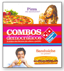 Na ação da DOMINO’S “COMBOS DEMOCRÁTICOS”, a frase que justifica a chamada é “a ordem dos fatores não altera o pedido”.